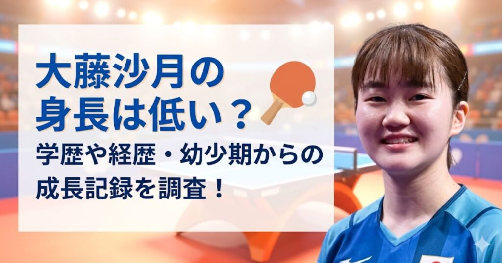 卓球界で注目を集める大藤沙月さん。 そんな大藤さんですが、身長や学歴、経歴について気になる方も多いのではないでしょうか。 今回は、大藤沙月さんの身長や学歴、経歴、そして幼少期からの成長記録について詳しく見ていきます。 大藤沙月の身長は低い?... -