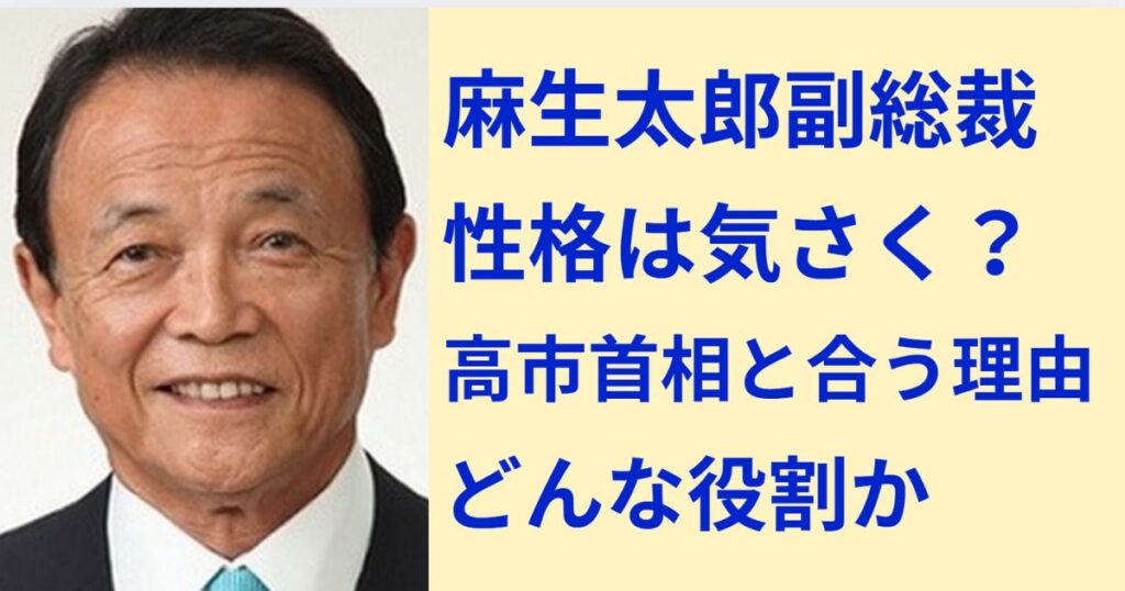 自民党の重鎮として長年政界で活躍してきた麻生太郎さん。 そんな麻生太郎さんですが、副総裁として高市早苗首相を支える立場にあり、その性格や役割が注目されています。 麻生太郎さんの性格は本当に気さくなのでしょうか。 また、高市早苗さんとの相性や... -