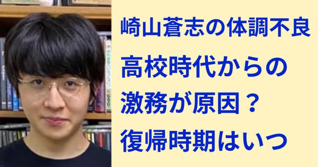 若き天才シンガーソングライターとして音楽界に衝撃を与えた崎山蒼志さん。 そんな崎山蒼志さんですが、体調不良により活動を休止することが発表され、ファンの間で心配の声が広がっています。 崎山蒼志さんの体調不良は高校時代からの激務が原因なのでし... -