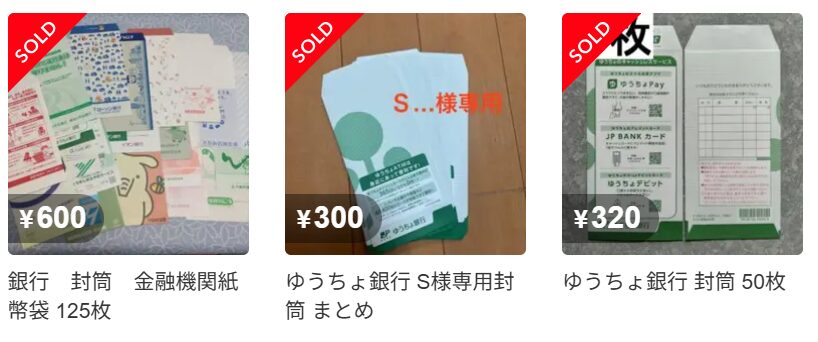 例えば、ゆうちょ銀行さんの封筒40枚が税込み300円で転売されているケースが確認されました。