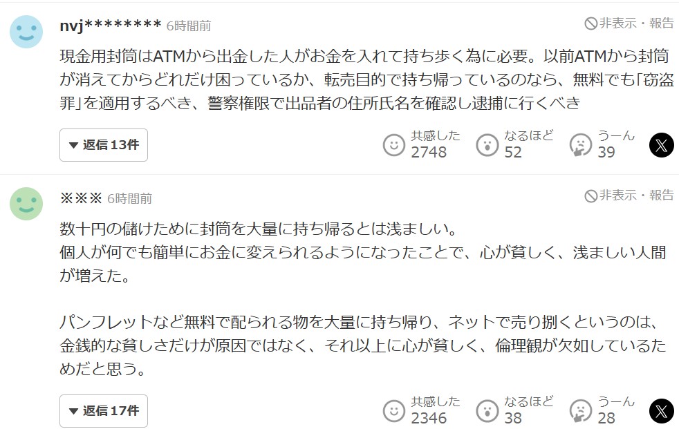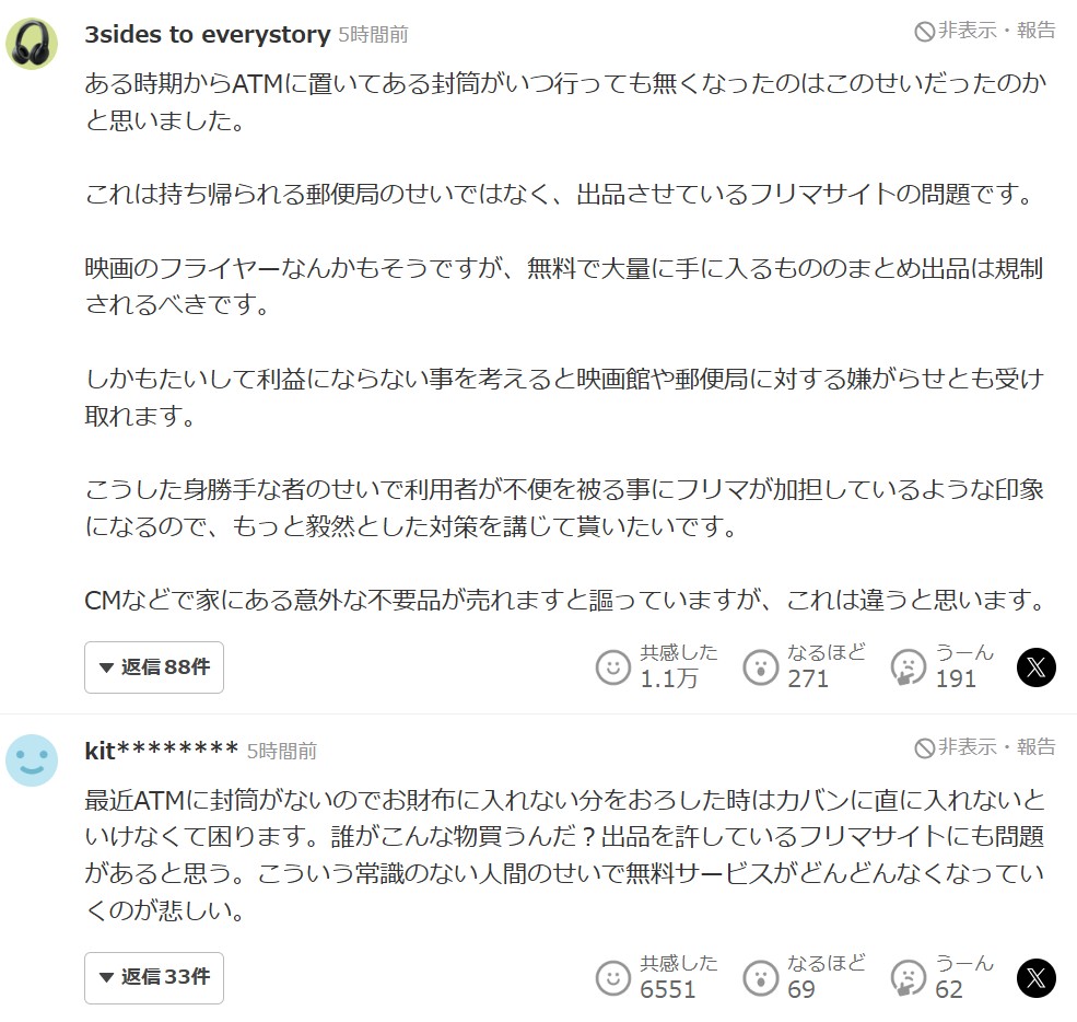 同時に、「それでなくなったのか」「無いと不便なんだよね」と、ATMで封筒が見つからず困惑する利用者の声も多く聞かれます。